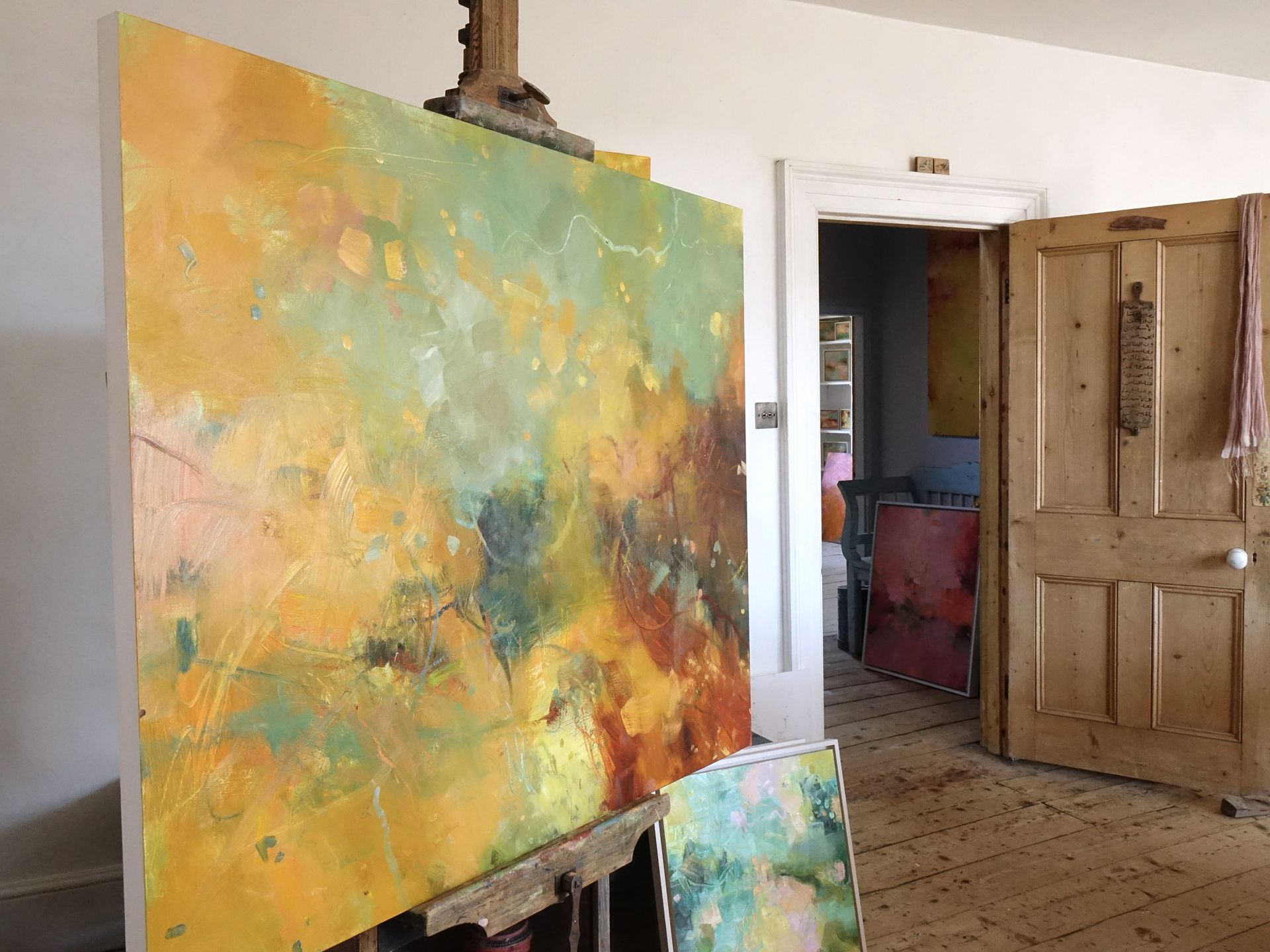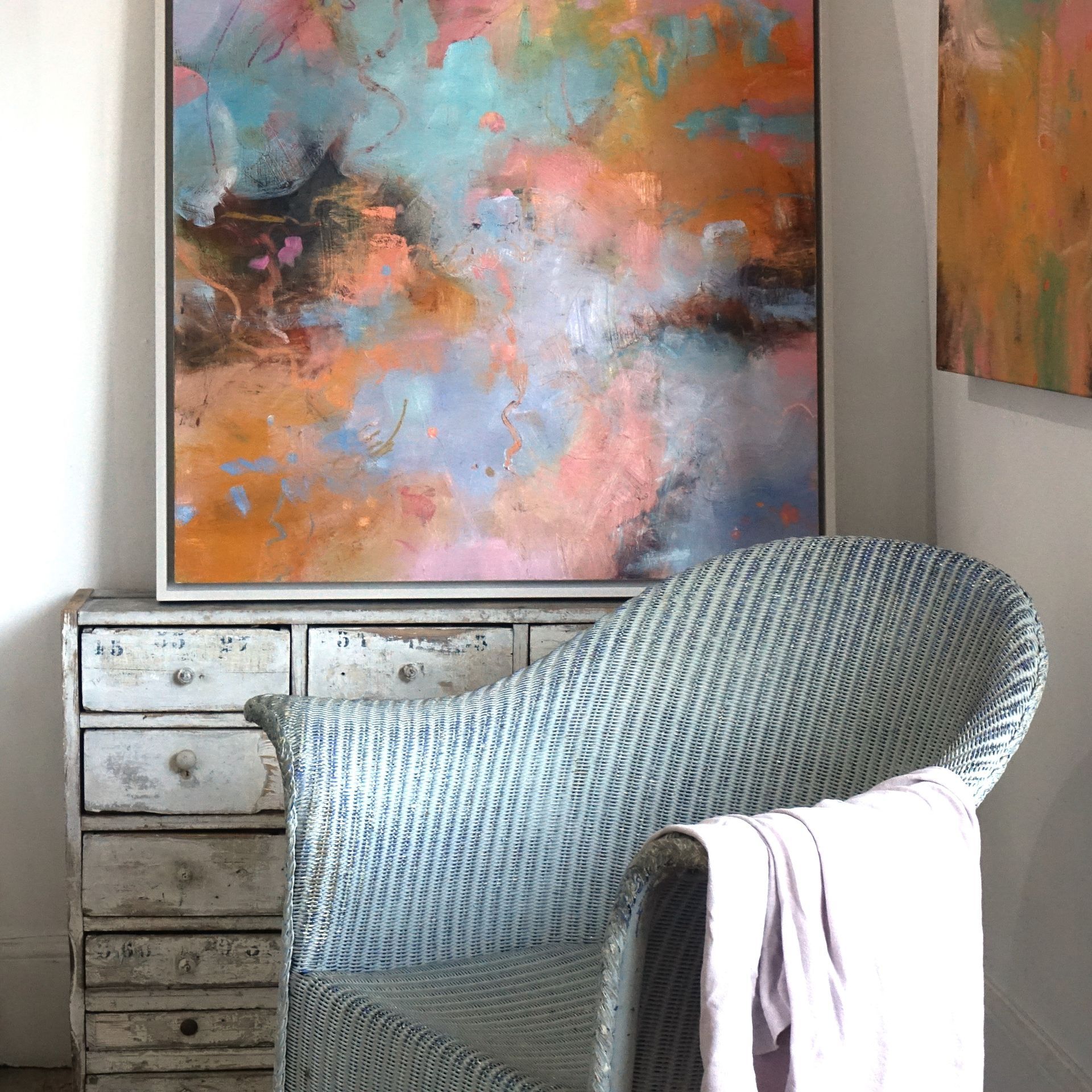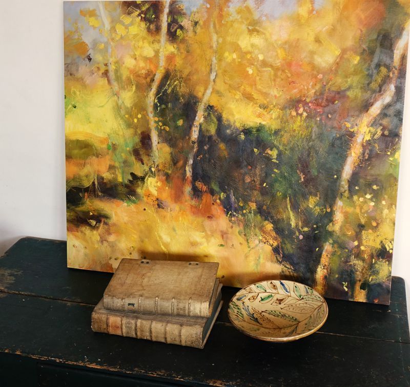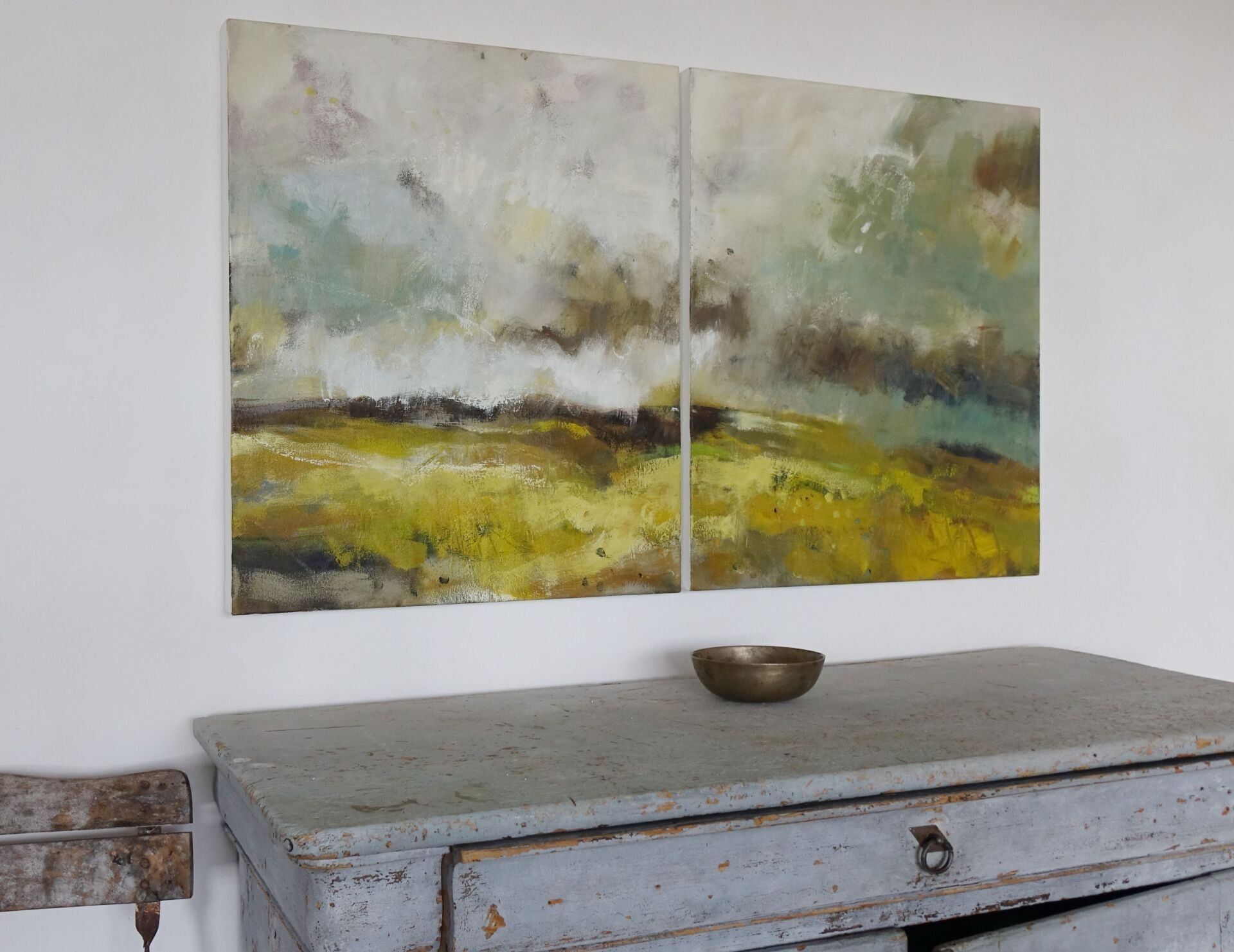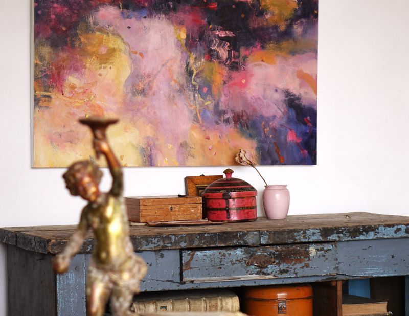 Below are some interior shots of the studio and house showing the working environment as well as paintings in situ and if there’s a specific painting anywhere on the site you’d like to see in your own home, we can superimpose any of the available images onto your own wall - just send a photo of your blank wall but leaving the furnishings in shot. Alternatively we can set it into one of our own home scenarios.